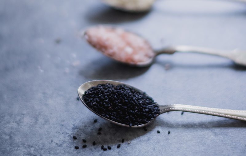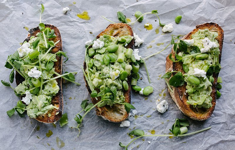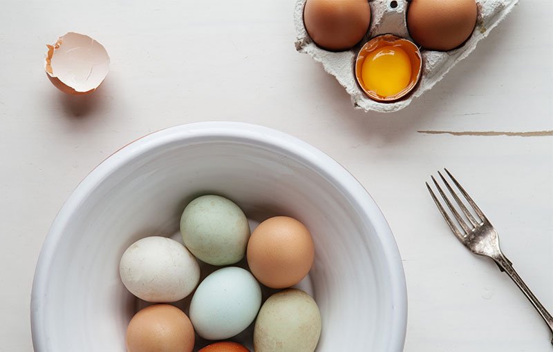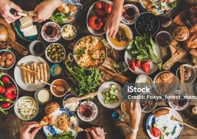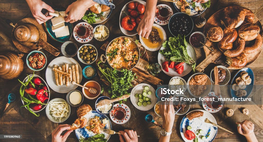 Turkish breakfast table. Flat-lay of peoples hands taking pastries, vegetables, greens, olives, cheeses, fried eggs, spices, jams, honey, tea in copper pot and tulip glasses, wide composition